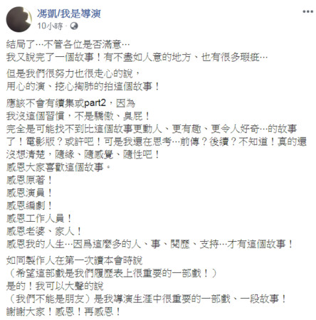 不过一切都仍在构思中,冯凯表示:“真的还没想清楚,随缘、随感觉、随性吧!”并直言很谢谢观众这3个多月来的收看,感谢原著和编剧的创作,谢谢演员和工作人员的贡献,当然不忘感谢家人在背后的默默支持,“感恩我的人生…因为这么多的人、事、阅历、支持…才有这个故事!”