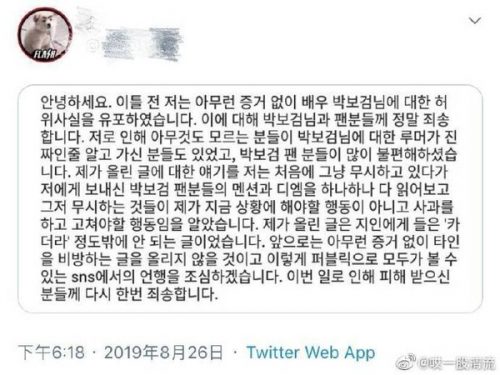 贴文者提及:“两天前我散布了毫无根据的关于演员朴宝剑的虚假事实。对此,我要向朴宝剑先生和他的粉丝们说声对不起。”表示自己一开始无视了消息上传后引发的轩然大波,在仔细看了粉丝们的私讯之后,才意识到事态的的严重性,也反省:“我现在应该做的是道歉并纠正内容。我上传的文字只是我从朋友那里听到的‘谣言’而已。以后我不会再上传毫无根据的、诽谤他人的文字。”目前该推特帐号已关闭。