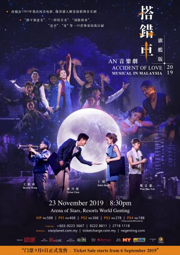 由 Star Planet 星艺娱乐主办,《搭错车》音乐剧 2019-马来西亚站的门票,将在 9 月 6 日,上午 11 时正式公开发售。凡在 9 月 3 日或之前,透过星艺娱乐官方网申请成为星 艺娱乐会员的客户,就可透过星艺娱乐办公室或者 www.ticketcharge.com.my 购票,并 享有 10% 折扣(除了 PS4 门票)。而云尊卡会员以现金或信用卡购票可享 5%折扣,以 云顶积分购票则享有 10% 折扣(优惠只限云顶网站或销售处购票),所有优惠门票数 额有限,须符合条件。