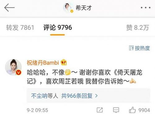 此前金希澈就在自己的微博账号上发过自己《倚天屠龙记》的追剧日常,一条 “长得像吗”的博文下配了自己和祝绪丹剧照的九张图片。9月1日,祝绪丹在金希澈该条微博下评论:“哈哈哈~不像,谢谢你喜欢《倚天屠龙记》,喜欢周芷若哦,我替你告诉她~”,网友纷纷表示:“祝贺金希澈追星成功!”“我的爱豆被他的爱豆评论啦!”“希大在线追星成功!”