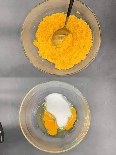 6.鸡蛋打入盆中,加细砂糖用蛋抽搅匀。
