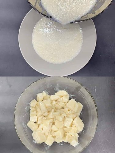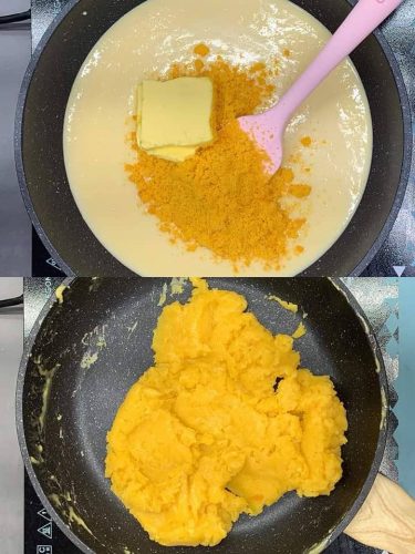 9.搅拌好的面糊过筛到不粘锅里,加入咸蛋黄碎、牛油,开小火翻炒。