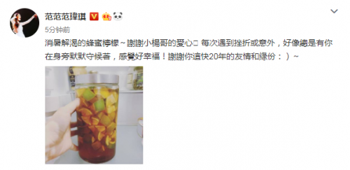 范玮琪秒删微博后首发文 感恩好友挫折中陪伴 10 Sep , 2019 | 娱乐前线 范玮琪在微博晒出一杯茶饮,并配文:“消暑解渴的蜂蜜柠檬~谢谢小杨哥的爱心每次遇到挫折或意外,好像总是有你在身旁默默守候着,感觉好幸福!谢谢你这快20年的友情和缘份:)~”9月8日晚,范玮琪曾发文回应梁静茹离婚:“我从来不是大嘴巴!保护!永远……保护你,守护你,陪伴你~爱你。”随后她秒删微博。 范玮琪微博截图 网友纷纷表示:“早日康复,期待新专!”“牙疼的我貌似很需要来一杯,分我分我!”“默默陪你,一起在幸福的路上!” 分享