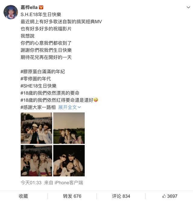 SHE18周岁生日 Ella晒珍贵无修图老照片 12 Sep , 2019 | 娱乐前线 11日凌晨,Ella陈嘉桦在社交网站上分享SHE初出道时的珍贵老照片,庆祝SHE出道18周年。 Ella保持着她一贯的自信和风趣的画风,配文道:“胶原蛋白满满的年纪,零修图的年代,18岁的我们依然漂亮的要命,18岁的我们依然红的要命还是还好。” 2001年9月11日,Selina,Hebe,Ella被唱片公司赋予了不同的角色加入SHE,随后她们发行了组合第一张专辑《女生宿舍》,没想到发行后在全亚洲的销量达到75万张,且入围了台湾新曲奖最佳新人奖,可谓一炮而红。 分享