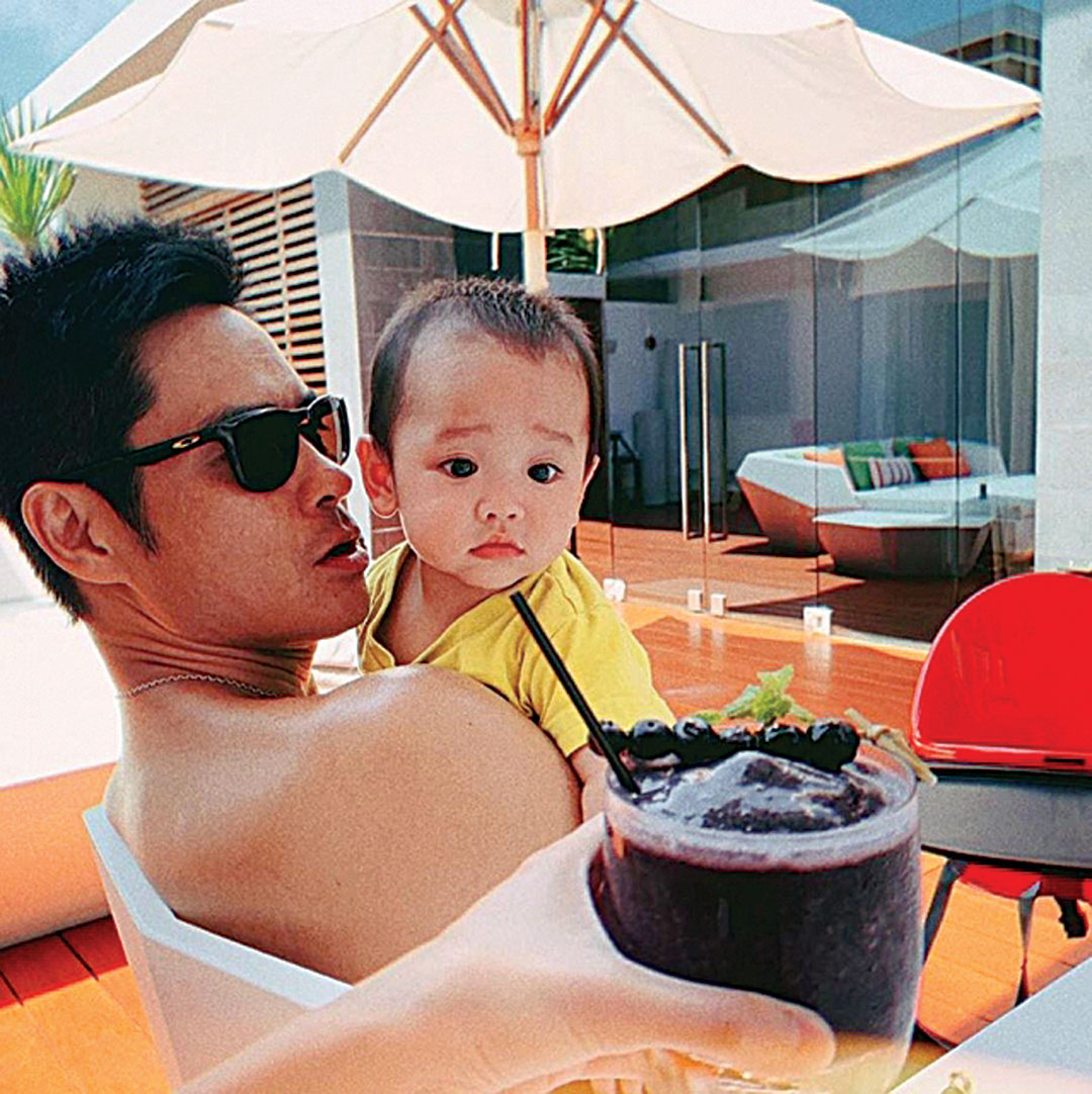 赤膊的郑嘉颖抱着儿子,坐在酒店房外的私人泳池晒太阳,一副有子万事足。嘉颖还模拟两父子对话,写道:“Rafa: Daddy, what’s that? Daddy: Purple drink. Day 2. #travelwithrafa”陈凯琳也留言:“Rafa: Mommy, who’s he? Mommy: A man.”