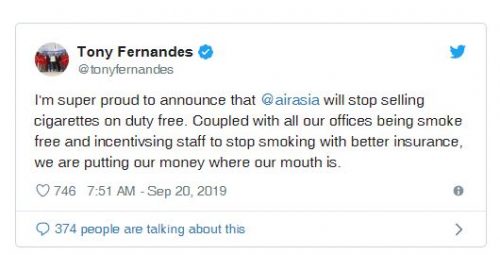 “我非常自豪地宣布,亚航将停止在机上销售免税烟,而且,我们期下所有的办公室都已禁止吸烟,并提供更好的保险来激励员工戒烟,我们要身体力行证明这一点。”