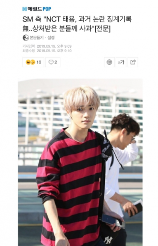 据韩媒报道,SM就旗下男团NCT 127成员李泰容2019年涉学校暴力事件发表相关立场。SM表示在确认相关资料的情况下,并没有发现提及报道相关内容或惩戒记录。并替李泰容为中学生时期,曾说过“没有分辨力的行动和伤害的话等”表示深深的后悔和道歉。