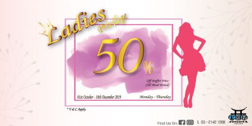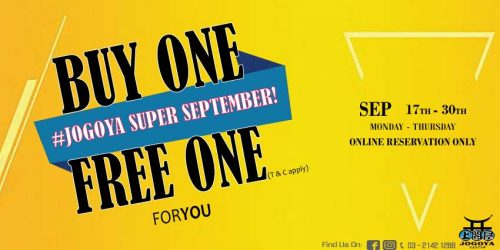 男士们也别失望,除了女士50%折扣以外,Jogoya早前也推出过买一送一的优惠!两人同行只需付一人费用,简直是超划算的啦!这项优惠从即日起至9月30日,用餐时间规定2小时!虽然适用于所有时间段,但不包括公共假期,而且必须提前一天通过网上订位哦!想吃的朋友注意了!