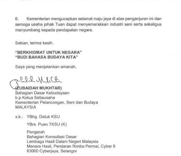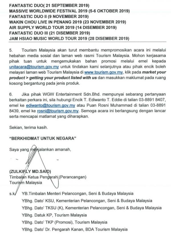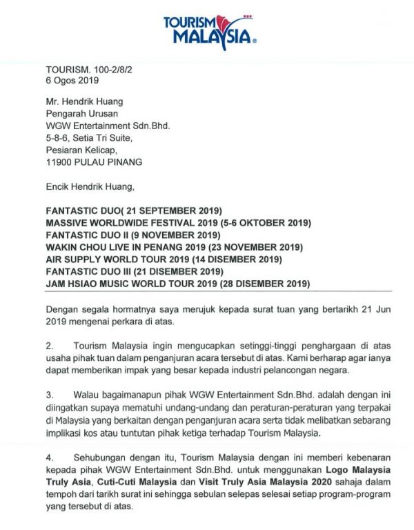 他在会上也出示3张印有旅游部信笺的公函,分别志期6月26日,内容指WGW公司可以凭相关文件申请扣税、7月4日旅游部副部长峇迪雅发信感谢WGW公司在推动旅游上的努力,以及8月6日批准WGW公司,使用旅游部的相关标志在其印刷海报上。