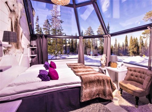 由于北极光会在空中闪现,出现的时间极短,所以你可能要在户外逗留一段时间才能捕捉千变万化的北极光。入住洛斯托村内的欧若拉酒店 Santa’s Hotel Aurora & Igloos,舒适地躺在温暖的玻璃穹顶客房欣赏璀璨壮丽的极光。这家酒店还备有一个北极光提示系统,保证你不会错过这个千载难逢的美景。