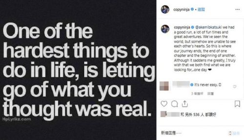 本以为两人恋情稳定才决定认爱,没料到相隔4个月,锦荣却于十月一日在IG发文并标记Akemi,表示两人一起经过了许多有趣的时光、伟大的冒险:“我们已经看到了这个世界,但是无法看到彼此的心。因此,这是我们旅程的终点,但是一章的结尾、另一章的起点。尽管这让我非常难过,但我真的希望我们俩都能找到想要的东西”,宣布两人正式分手。Akemi则透过经纪人回应:“我们人生有不同的计划。”