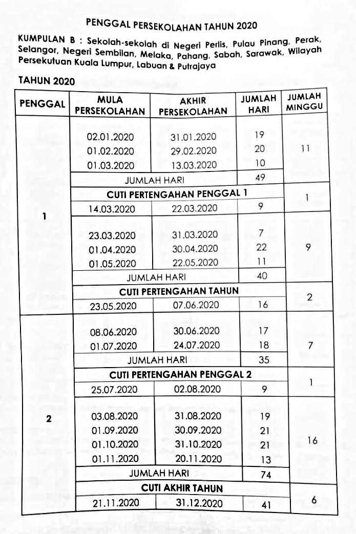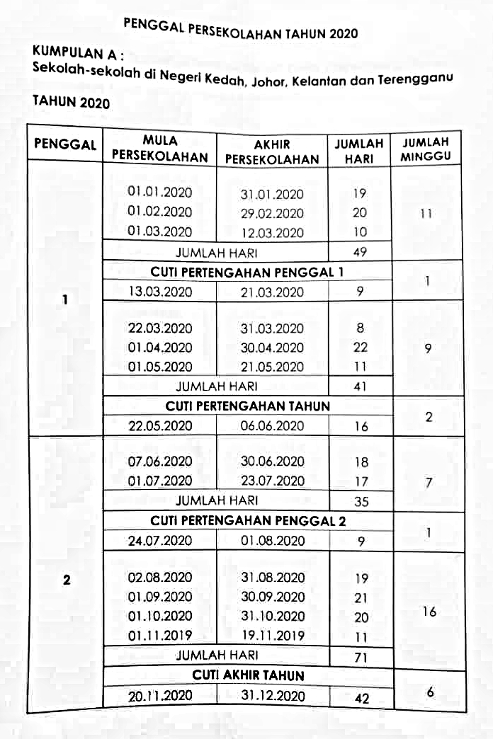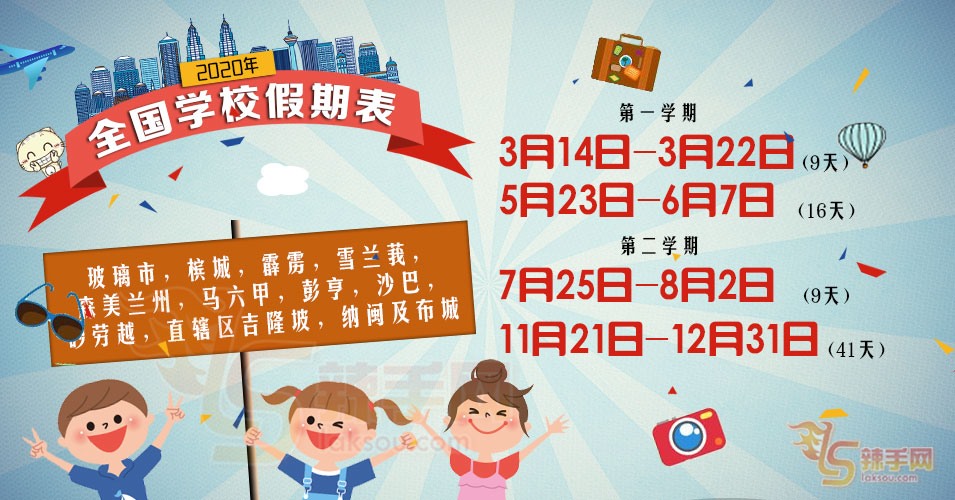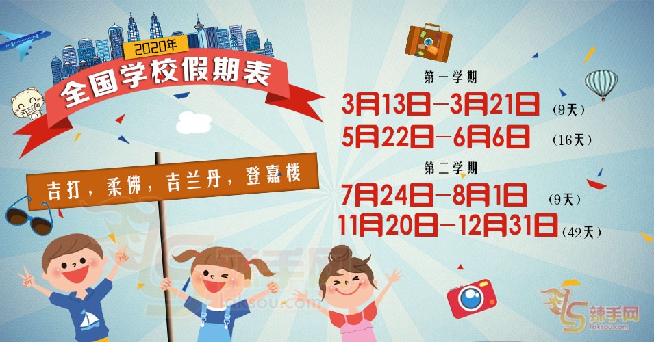 2020年学校上课假期时间表出炉! 4 Oct , 2019 | 民生关注, 民生百事 (吉隆坡4日讯)千呼万唤,教育部终于发布了2020年全国学校上课及假期时间表。 根据教育界传来的消息,2020年学子们上课天数有197天(与吉隆坡同组周属),放假169天(假期75天/周末或公假休息96天)。 吉打、柔佛、登嘉楼、吉兰丹的学子则是上课196天、放假170天。 分享