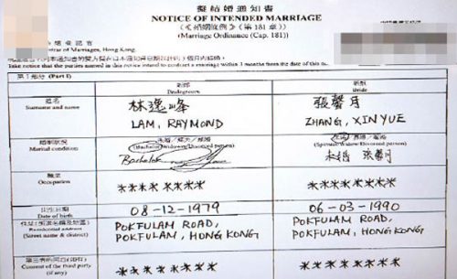 虽然当日林峯透过经理人表示:“关于感情事不会作出任何回应”,但“身体却很诚实”的他已付诸行动,于上月26日在港秘密入纸排期注册结婚,与计划12月“做老衬”的传闻不谋而合!其拟结婚通知书亦正式曝光,当中见到林峯以本名林逸峰入纸,而张馨月的出生日期显示为1990年3月6日,与网上资料显示的1990年9月18日有出入,相差半年。至于二人的住址同样报称位于薄扶林,可见张馨月已由去年入往的帝景园,搬到林峯于2015年以逾6千万港币购入的薄扶林嘉林阁複式单位,共筑爱巢。