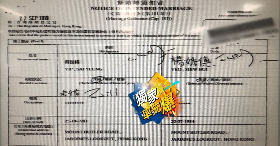 《on.cc东网》发现他们于上月24日正式递交拟结婚通知书,通知书上杨秀惠以其原名“杨㛢僡”来登记,而丈夫名字则正式曝光,姓名是叶世扬,年纪比女方大3年,两人共同报称住址为渣甸山毕拉山道,但职业一栏均从缺。