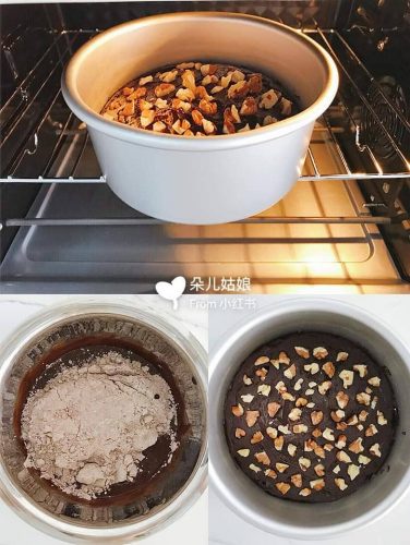 4.将巧克力面糊倒入模具中,墩平表面,均匀的在表面撒上核桃碎