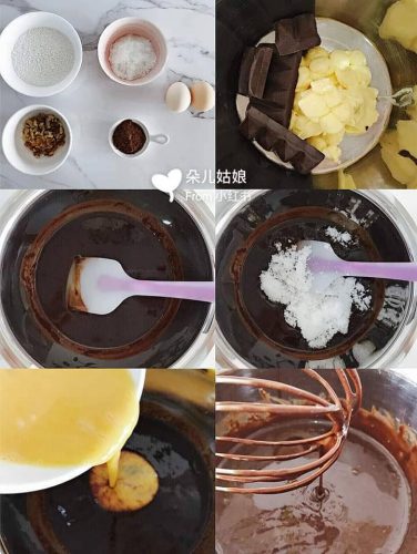 1.牛油与黑巧克力隔水加热至融化,搅拌均匀