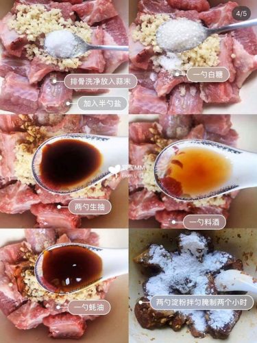 1.排骨洗净放入蒜末,半勺盐,一勺白糖,两勺生抽,一勺料酒,一勺蚝油,两勺淀粉,拌均匀腌制2小时入味