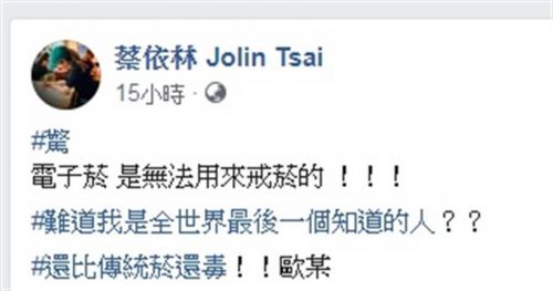 蔡依林睽违11年再度化身拒烟大使,倡导“我拒烟,我骄傲!所有烟品Get Out!”活动,并以义工身分呼吁“电子烟有害身体”,还录制短片宣导,不过却传出卖电子烟的烟商到现场欲闹事,据悉是跟蔡依林之前脸书PO文有关。