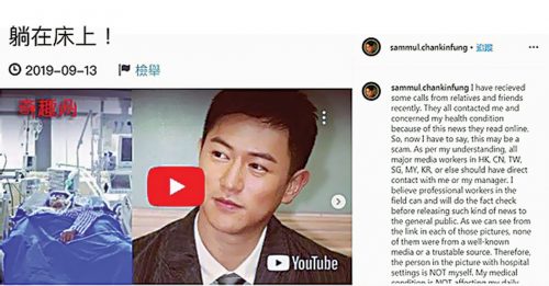 陈键锋最近频频收到亲友关心,原来是卧病在床的消息连亲戚朋友都受到惊吓,他为此澄清谣言“我必须说这是骗人的。”他认为相关媒体单位应该试着和自己,或是经纪人联系,相信报道前应该要针对事实进行查证,同时翻摄卧床截图,强调“照片中的人不是我。”