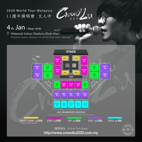 票价:(摇滚区) RM588、( VVIP) RM488 、( VIP) RM388、(CAT 1) RM288、(CAT 2) RM188