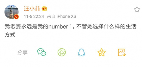 甜!汪小菲表白大S称老婆永远是我的NO.1 6 Nov , 2019 | 娱乐前线 汪小菲发文甜蜜表白老婆大S徐熙媛:“我老婆永远是我的number 1。不管她选择什么样的生活方式。” 汪小菲发文甜蜜表白老婆大S徐熙媛:“我老婆永远是我的number 1。不管她选择什么样的生活方式。”微博一出,粉丝纷纷表示:“支持小菲哥!”“半夜喂狗粮我怕胖。”稍晚,汪小菲又将该微博删除。 分享