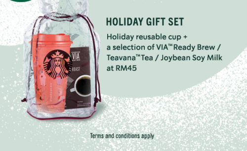 Holiday Gift咖啡套装则需要RM45,里面包含一个星巴克杯子+你可以选择VIA Ready Brew/Teavana Tea/ Joybean Soy Milk)!