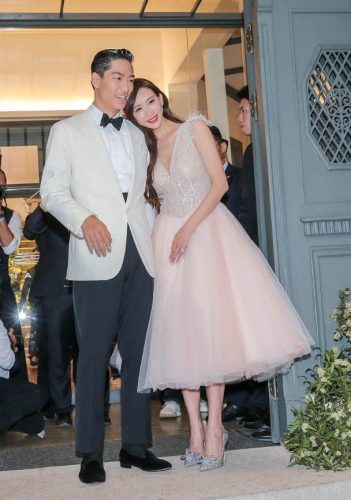 林志玲搭着礼车进入会场,晚间穿着订制的深V粉嫩羽毛礼服现身,依偎在老公AKIRA身边,非常甜蜜。AKIRA则一身白色西装搭配黑色领结帅气。两人先是在二楼朝大家亲切打招呼,随后便下楼接受媒体采访,两人甜蜜互吻。当被记者问给老公打几分时,林志玲羞涩的说到100分,林志玲笑回:“努力!”婚礼最后就是洞房花烛夜,许多媒体也好奇生子进度。有媒体称:“今天!”她打趣作势惊喜一下,想了几秒回:“请大家一起祈祷!”