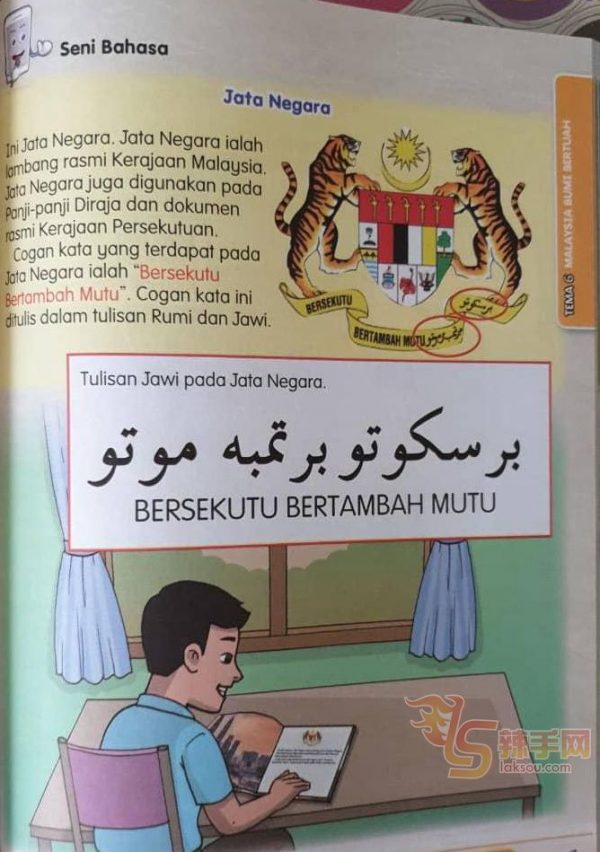 不仅如此,在第6课“马来西亚是幸运之地”课纲,会学习国徽上“团结就是力量”(Bersekutu Bertambah Mutu)的爪夷字。