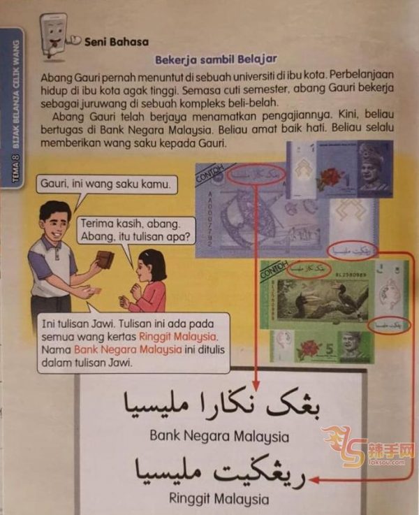 至于第8课“精明消费”,学生则会认识到1令吉和5令吉钞票上的爪夷文字。