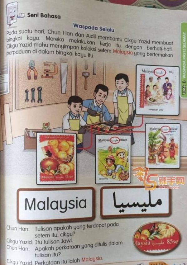 学生在学习第3课“谨慎确保安全”时,会透过邮票认识“马来西亚”的爪夷字。