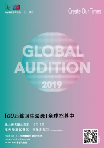 自2019年10月 ,“Kre8音乐实验室 x 寰亚 Global Audition 2019”于全球进行练习生招募,引发了整个华语娱乐圈的轰动。Kre8 团队希望在全球寻找热爱音乐,热爱舞台的00后年轻人,通过对他们进行一系列专业训练,为华语娱乐圈打造新一代全方位青年偶像。 目前,北京、上海、广州、成都、台北赛区已经陆续开启了线下复试阶段。