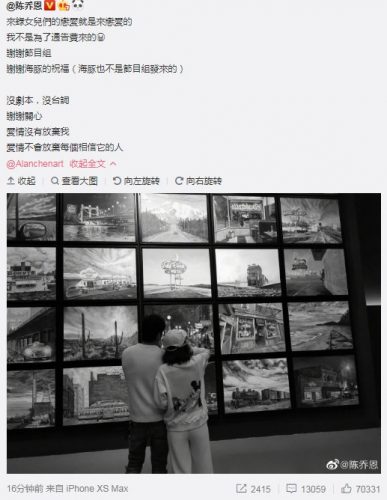 陈乔恩微博发文承认与小9岁大马男友艾伦的恋情。随后艾伦发文:“In the world of billions of people, we were meant to find each other.Love never leave us or anybody.A life of few decades is too short for anything, so just be brave to love!The happy moments seen by all, can only be truly felt by two.Thank you Mango TV, viewers and the family of dolphins for the blessings.Thank you Joe。@陈乔恩”(在数十亿人的世界中,我们注定要找到彼此。爱永远不会离开我们或任何人。几十年的生活对任何事物来说都太短了,所以勇敢地去爱吧!所有人所看到的幸福时刻,只有两个人才能真正感受到。谢谢芒果电视台,观众和海豚一家的祝福。谢谢乔。)网友纷纷表示祝福,留言道:“无论如何,要对她好,好好爱她。”