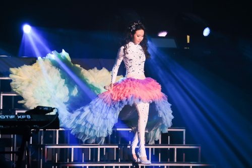 莫文蔚在2小时30分的演出内更换了多套服装,从开场的金色豹纹流苏舞衣到黑皮革猫女装、更化身七彩“花仙子”,搭配上舞台绚丽灯光效果,充分展现撩人风姿。除了百变造型,莫文蔚更大秀钢琴、古筝以及传统鼓等才艺,演出诚意绝对满分!