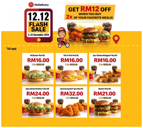 配合双十二的到来,麦当劳将推出促销活动!从即日起至12月24日期间,你只要通过McDelivery购买两份麦当劳套餐,即可以RM16购得!简单来说,就是一份套餐最低只需RM8!