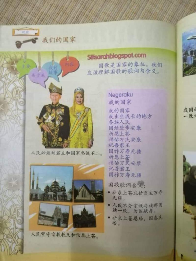 另一方面,根据《新海峡时报星期刊》报导,有网民指国歌的华语版歌词早就出现在华小5年级的历史课本内,而这本课本是由国家语文局(Dewan Pustaka dan Bahasa)于2014年出版,是根据小学标准课程(KSSR)所修订。