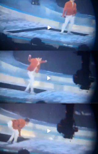 不过,张艺兴表演完鞠躬致意后转身离去,脚下的升降台却突然下降,疑似信号没有打好他整个人差点跌倒,好在他反应很快马上用手撑住,接着一个转身继续维持鞠躬姿势到台下。这突然的情况也吓坏了现场的粉丝,粉丝纷纷大喊“小心”。