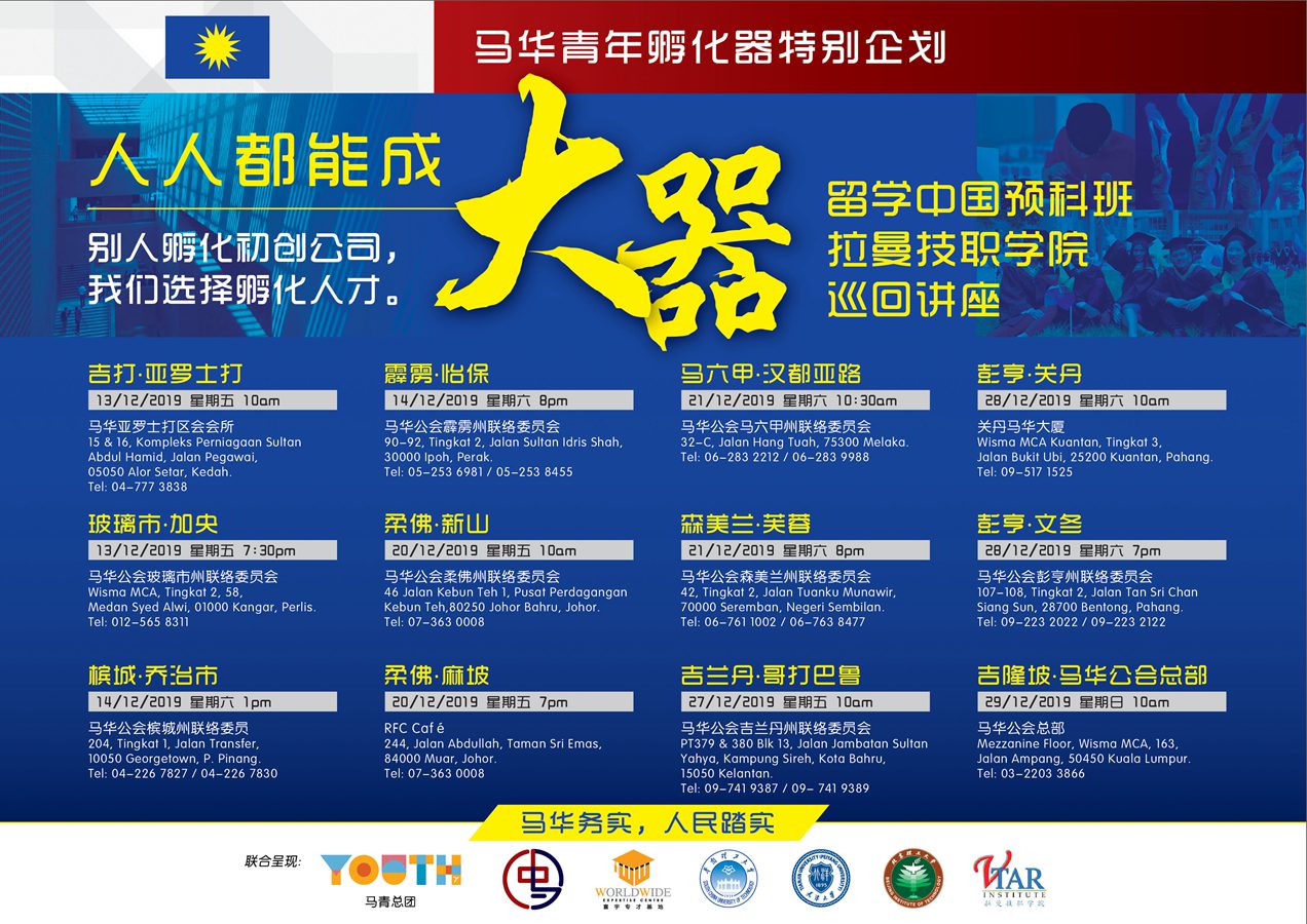 (吉隆坡10日讯)马华青年孵化器“中国留学特别企划、拉曼技职学院”教育展,将从本月13日开始至29日,在全国各州举办12场巡回讲座,欢迎中学毕业生、统考生前往聆听及了解课程详情。
