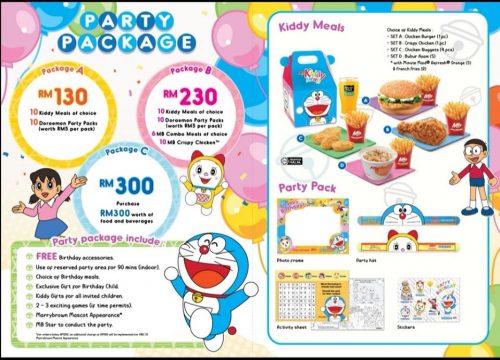 哆啦A梦庆生配套分为三种,包括RM130、RM230及RM300!配套中包含各种周边商品,如哆啦A梦贴纸、哆啦A梦头套及相框等!如果时间允许,主办单位也会准备二到三种游戏,让孩子们参与!哆啦A梦主题派对从即日起至2020年5月!欲知更多详情,可浏览marrybrown.com/birthday-party/。