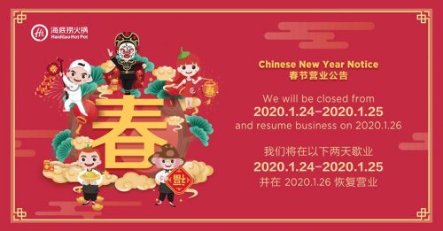 海底捞春节营业公告 想吃的朋友等之后吧! 2 Jan , 2020 | 吃喝玩乐 新年过节想吃海底捞?这里提醒你,海底捞将在大年除夕和初一休业,所以想吃的朋友等之后吧! 根据大马海底捞发出的消息,海底捞将会在1月23日6pm结束营业,并且1月26日12pm才恢复营业!这意味着年除夕和年初一,海底捞将会停止营业!目前,海底捞在大马开设了四家分店,包括Sunway Pyramid、Pavilion、1 Utama和Gurney Paragon! 分享