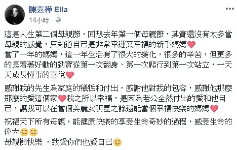 “Ella“陈嘉桦与老公赖斯翔婚后育有一子“劲宝”,母亲节将至,Ella在脸书分享为人母一年多来的心情,更秀出儿子学站的照片,超萌模样迷倒一票粉丝。