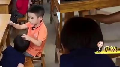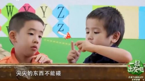 《一起出发吧》其中一期当中,小朋友们都坐进教室里,Jasper看到躲下桌子的弟弟觉得很担心,心急的他把“不要碰到你的头了”讲成“不要拿你的头了”,对方完全没有听懂继续蹲在桌底。