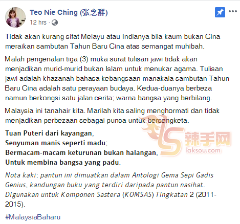 她是在昨晚将近凌晨12点时发表帖文,指当非华裔一起庆祝华人农历新年,并不会使到巫裔和印裔各自失去马来人或印度人特征,同样的3页爪夷文也不会使到非穆斯林学生改教。