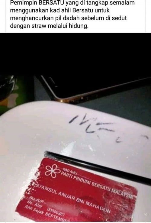 用党员证磨碎毒品吸食 14 Jan , 2020 | 民生关注 (吉隆坡14日讯)有没有搞错!竟然用党员证来磨碎毒品! 土团党龙溪州议员阿希赛安与政府高官在夜店涉嫌吸毒案有惊人的进展,网络流传出一张土团党的党员证,怀疑是涉及者将之用来磨碎毒品后再用吸管吸食。 根据社交媒体流传的帖文,指这是土团党领袖在用吸管吸食毒品前,使用党员证磨碎毒品,并附上一张土团党党员证,旁边还有一根黑色吸管,而周围的白色粉末相信就是毒品。 有关照片相信是警方日前展开突击行动时,拍下的照片,不过被流传出去后在网上广为流传。 分享