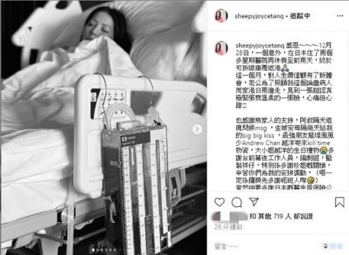 艺人滕丽名31日突然在社交网上传了躺在病床及坐轮椅的医院照,情况令人忧心,她发文表示在日本旅行时出了意外,并在当地的医院住了两个多星期才返港,但没有详细讲所患何病及出了什么意外,她说:“感恩~~~12月28日,一个意外,在日本住了两个多星期医院再休养至前两天,终于可拆线康覆(复)返港”