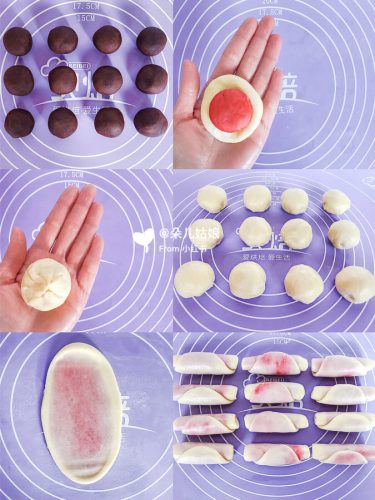 3)“水油皮”面团分为18g/个的小面团,“油酥”面团分为13g/个的小油酥团,“红豆沙馅”分成12g/个小馅儿团