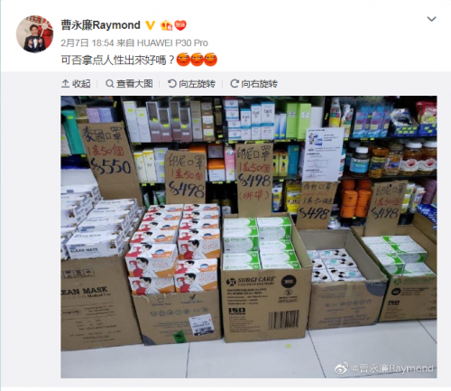 无良商家高价售卖口罩 曹永廉怒斥:无人性 9 Feb , 2020 | 娱乐前线 TVB艺人曹永廉在微博上传照片,怒斥商家高价售卖口罩表示:“可否拿点人性出来好吗? ” 照片中,一盒50个的口罩标价最低498港币(约266令吉),最高售卖550港币(约295令吉)。随后众多网友转发支持曹永廉,斥责无良商家高价售卖口罩,发国难财不可取。 分享