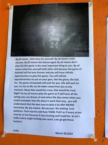 “届时你将会明白,上了赛场无论如何都要打好比赛,不管以任何一种方式,没有借口,没有迟疑。去他的耐心,去他的伤病,去他的所有的其他人。要将每次的击球当成是最后一次,因为这太有可能了,所以我们要让每个时刻都充满意义,让我们莫负今朝。“——Kobe,2019年3月28日。”