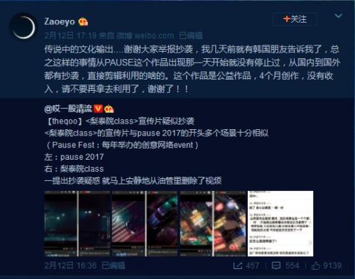 由朴叙俊、金多美主演的韩国漫改电视剧作品《梨泰院class》因其精良的制作水准、演员演技以及造型人物而受到广泛关注和普遍好评。然而,近日有韩国网友发现该剧放出的一则宣传片与中国有名的《Pause 2017 Opening Titles》很是相似,由此陷入抄袭风波。而国内原版《Pause 2017 Opening Titles》的作者Zaoeyo在事情发酵后也作了回应,希望《梨泰院class》剧方不要再拿去利用。