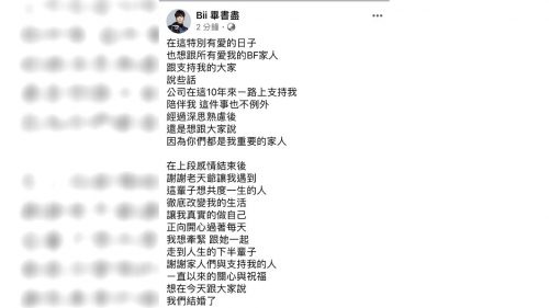 没想到今他无预警在脸书上宣布结婚喜讯,“在这特别有爱的日子,想跟所有爱我的BF家人跟支持我的大家说些话…经过深思熟虑后,还是想跟大家说,因为你们都是我重要的家人。”