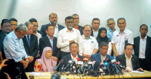 安华在旺阿兹莎、林冠英、莫哈末沙布等人陪同下,在公正党总部召开希盟“紧急”记者会。